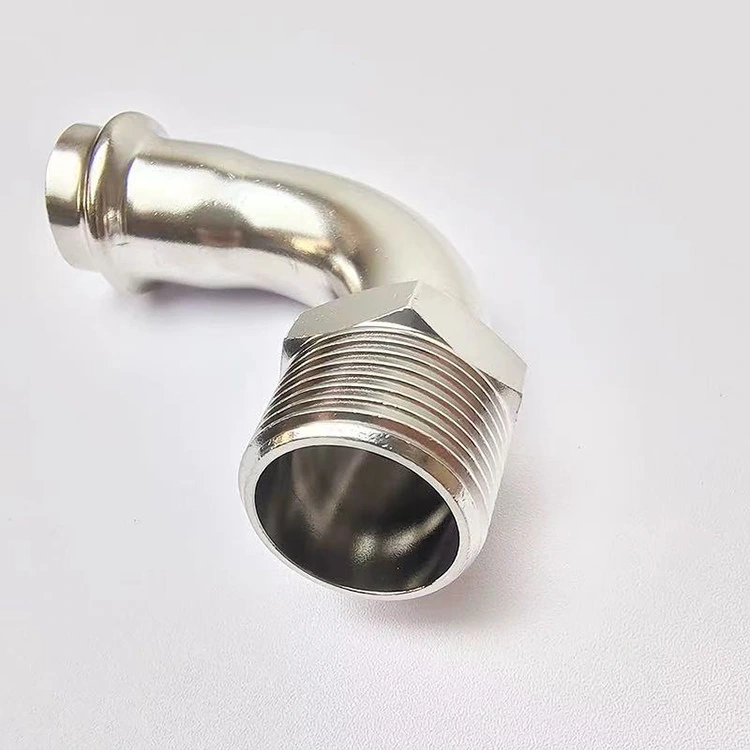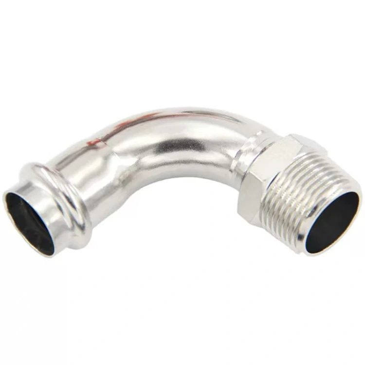 「油圧ツールを使用して、一端がステンレス鋼管にワンタッチで押し付けられ、もう一端が雄ねじを突き出し、各種雌ねじ界面にねじ込むエルボ継手」と理解できます。これは、ステンレス鋼配管システムの端子接続およびターン用の重要な変換コンポーネントです。